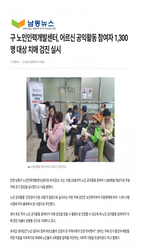 공익활동 참여자대상 치매검진 실시 페이지 정보 작성자 김선영 작성일26-04-14 17:26 조회9회 댓글0건 관련링크 다음글 목록 본문 . 댓글목록 등록된 댓글이 없습니다. 다음글 목록