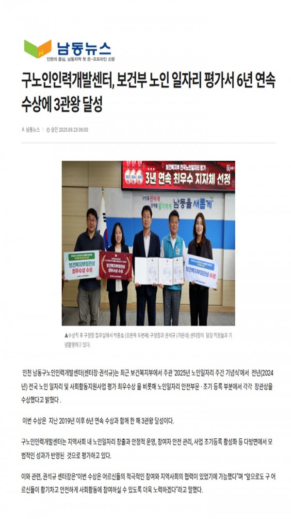 남동구노인인력개발센터 6년 연속 수상[2025년 노인일자리주간 기념식] 3관왕 달성 페이지 정보 작성자 김선영 작성일25-09-23 10:23 조회34회 댓글0건 관련링크 이전글 다음글 목록 본문 . 댓글목록 등록된 댓글이 없습니다. 이전글 다음글 목록