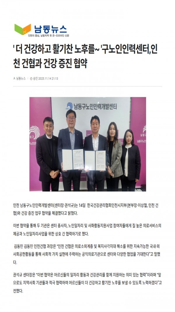 한국건강관리협회인천시지부와 건강증진 업무 협약 체결 페이지 정보 작성자 김선영 작성일25-11-17 10:59 조회17회 댓글0건 관련링크 다음글 목록 본문 . 댓글목록 등록된 댓글이 없습니다. 다음글 목록