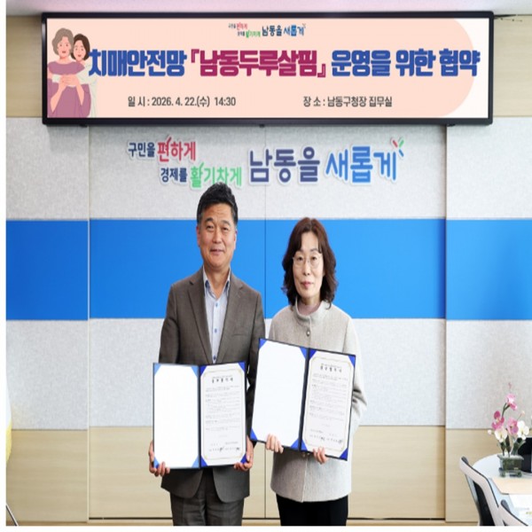 남동구노인인력개발센터(센터장 유석금)는 2026년 4월 22일 남동구보건소와 함께 치매환자 실종예방사업 「남동 두루살핌」 업무협약을 체결하였다.