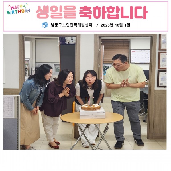 2025년 10월 직원생일 페이지 정보 작성자 김선영 작성일25-10-01 11:14 조회53회 댓글0건 관련링크 다음글 목록 본문 남동구노인인력개발센터(권석규·센터장)는 2025.10.01(수) 10월 생일자를 대상으로 축하의 시간을 가졌다 댓글목록 등록된 댓글이 없습니다. 다음글 목록