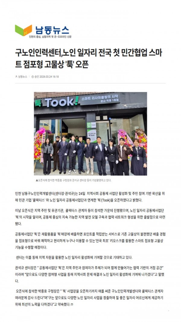 노인일자리 전국 첫 민간협업 스마트 점포형 고물상 '툭'오픈 페이지 정보 작성자 김선영 작성일26-03-24 17:13 조회10회 댓글0건 관련링크 이전글 다음글 목록 본문 . 댓글목록 등록된 댓글이 없습니다. 이전글 다음글 목록