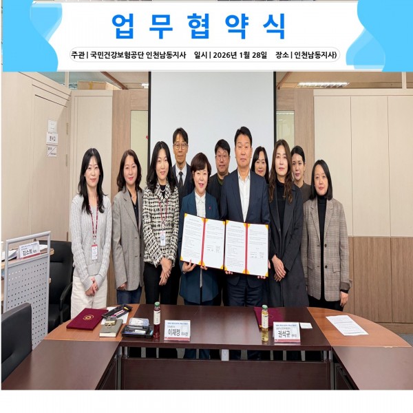 국민건강보험공단 인천남동지사 노인일자리 확대 위한 업무협약 체결 페이지 정보 작성자 김선영 작성일26-01-29 16:15 조회44회 댓글0건 관련링크 다음글 목록 본문 남동구노인인력개발센터(센터장 권석규)는 1월 28일(수) 국민건강보험공단 인천남동지사(지사장 이재정)와 노인일자리 활성화 및 공공서비스 강화를 위한 장기요양통합서비스지원 업무협약(MOU)을 체결했다. 댓글목록 등록된 댓글이 없습니다. 다음글 목록